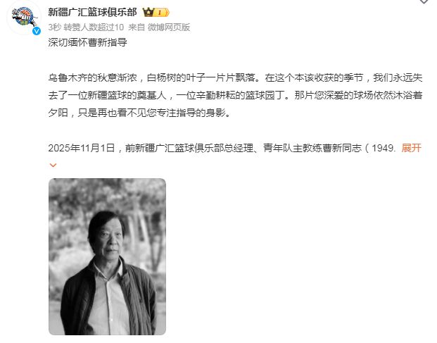 北京时间11月3日,新疆篮球俱乐部官方发布公告,前新疆广汇篮球俱乐部总经理、青年队主教练曹新同志因病与世长辞,享年76岁。曹新指导是球队首任总经理,还转型出任过青年队主教练,