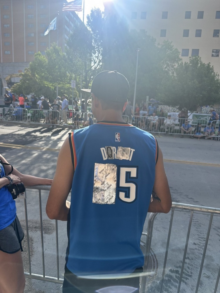 在现场,一名球迷身穿“多特”的爆改球衣,可以看出原版应该是一件杜兰特的35号球衣。