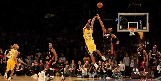 时刻:科比运球到前场,在贝尔和迪奥的双人夹击下,急停跳投出手。球进!湖人绝杀取胜。