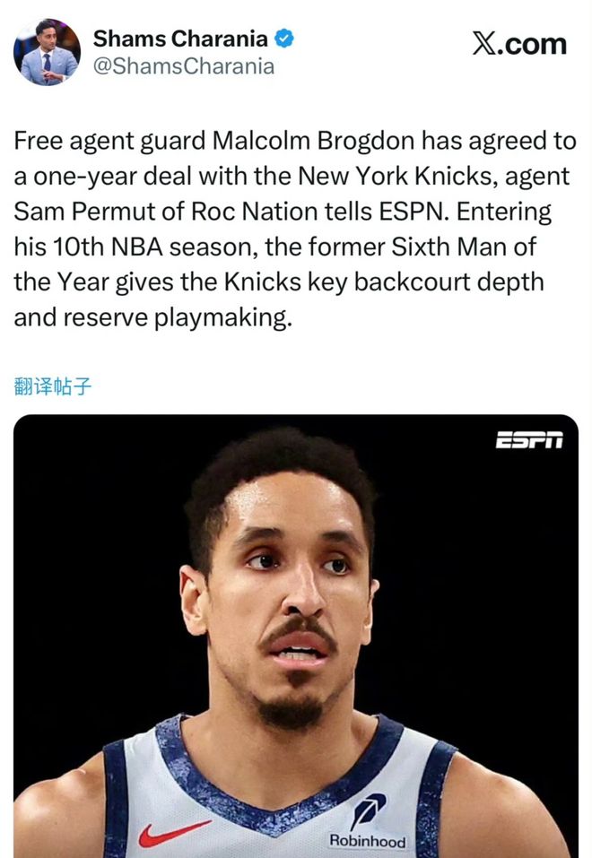 Shams:布罗格登以1年合同签约尼克斯。紧急着美记Sidery跟进报道称,布罗格登与尼克斯签下的是一年老将底薪合同。