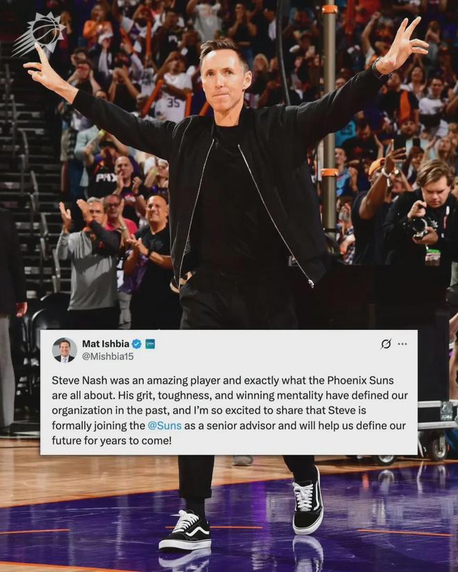 老板亲自宣布:纳什加盟太阳担任球队的高级顾问。这哥们曾在太阳效力多达十个赛季,场均贡献14.4分9.4助,04-05以及05-06赛季均拿下MVP。出生于1974年2月7日的纳什,今年51岁,1996年