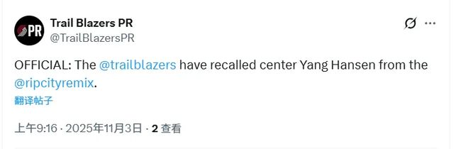 北京时间11月3日,开拓者官方宣布召回杨瀚森,根据此前报道,他将随队参加明日对湖人的比赛。队记Mike Richman在播客上谈到了杨瀚森的话题。他指出开拓者下放瀚森到发展联盟,有可
