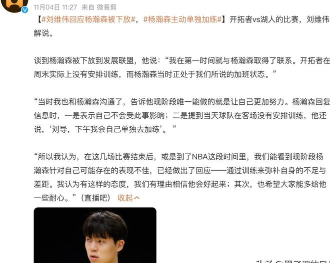 11月5日刘维伟首次公开谈论了杨瀚森近期的情况,一番话让球迷彻底放下心来。