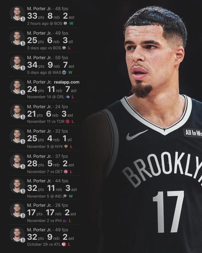 自从离开掘金,很少看到小迈克尔-波特的新闻。其实他最近打得不错,过去8场比赛,小波特在篮网场均砍下27.8分7.5篮板3.3助攻,投篮命中率50.3%,三分命中率40.6%。赛季至今,小波特打了