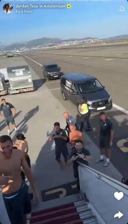 荷兰球星乔丹·泰泽拿出手机,记录下这令人难以置信的一幕。这位25岁的球员将视频分享到社交媒体上,画面中全队几乎只穿内裤,以避免中暑。 随后,球员们未换衣服就下机,半裸地站在跑道上。