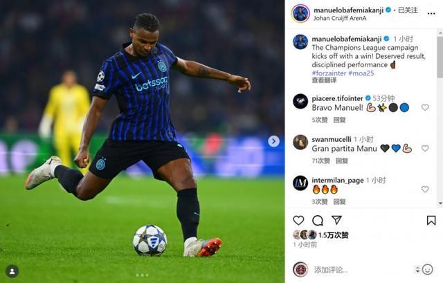 直播吧9月18日宣 欧冠联赛阶段第一轮比赛,阿坎吉踢满全场,国米客场2-0击败阿贾克斯。阿坎吉社媒晒出比赛照片,并写道:“以一场胜利开启欧冠征程,实至名归的结果,纪律严明的表现。