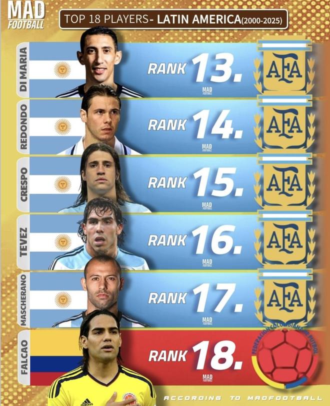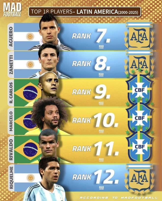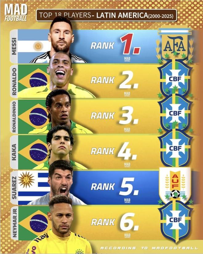 近日,足球数据媒体 MAD FOOTBALL 发布了《2000—2025年拉丁美洲最佳18名球员榜单》。这份榜单涵盖了过去25年最具影响力的南美球星,从梅西到罗纳尔多,从苏亚雷斯到内马尔,几乎囊