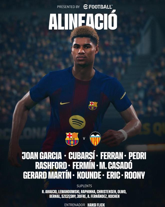 巴萨vs瓦伦西亚:拉什福德、巴尔德吉首发,莱万替补