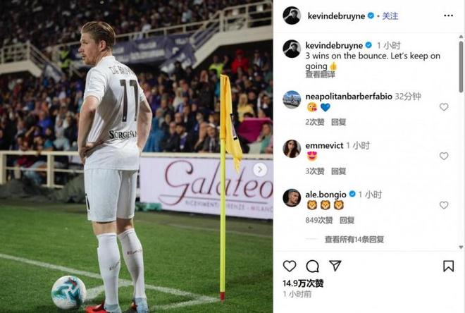 德布劳内更新社媒庆贺胜利:连胜3场!让我们继续加油