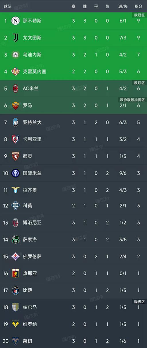 北京时间9月15日,意甲第3轮结束了8场比赛,最新积分榜如下!