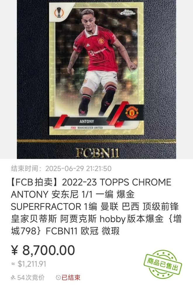 从上图近一年的安东尼球星卡价格走势图可以明显看出,在冬窗25年1月安东尼正式租借至皇家贝蒂斯后,原本萎靡不振的卡价明显攀升,直到如今“现象级”表现的过渡后虽稍有回落但与一年前相比指数上涨高达21%,一张22-23TChobby安东尼的爆金base卡,在今年6月底以8700元成交,可见国内外收藏者们对于安东尼的“爱”。