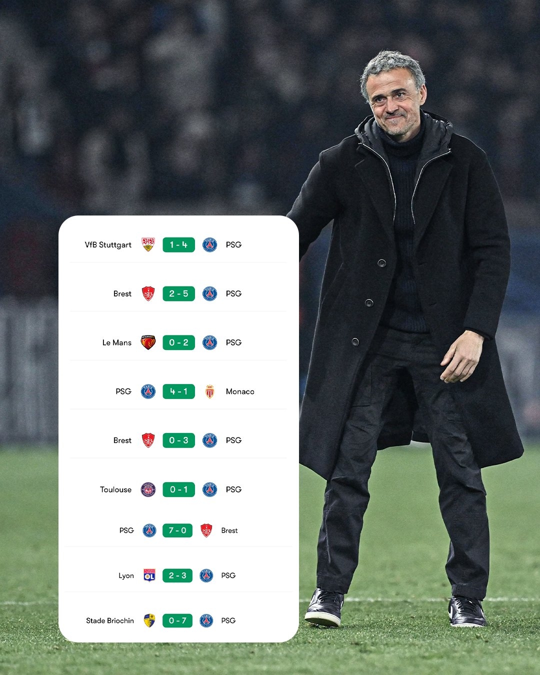 巴黎三线豪取九连胜&进36球丢6球:4-1斯图加特;5-2布雷斯特;2-0勒芒;4-1摩纳哥;3-0布雷斯特;1-0图卢兹;7-0布雷斯特;3-2里昂;7-0布里欧奇