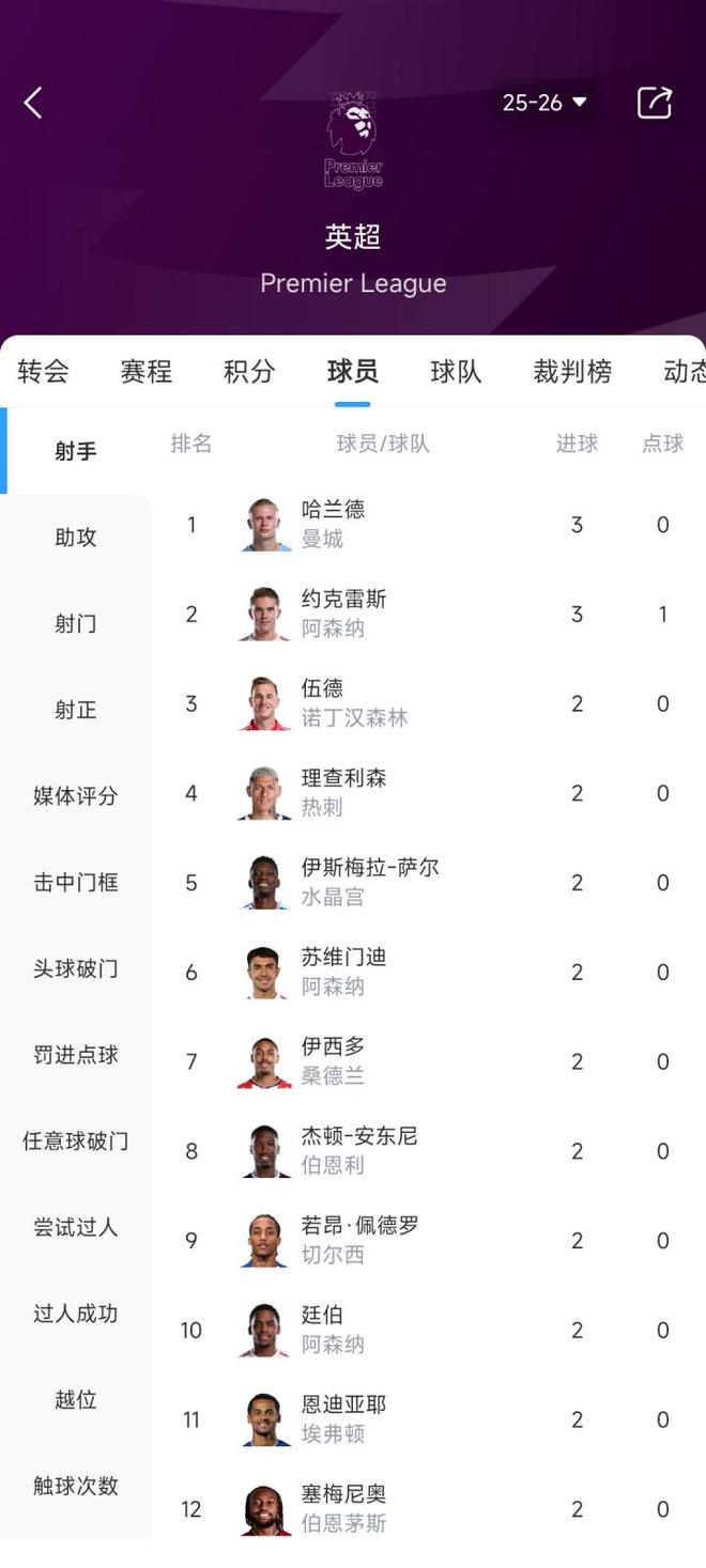 直播吧09月13日宣 英超第4轮,阿森纳主场3-0完胜诺丁汉森林,枪手中锋约克雷斯打进一球,新赛季英超前4轮3球,与哈兰德并列射手榜第一。英超射手榜: