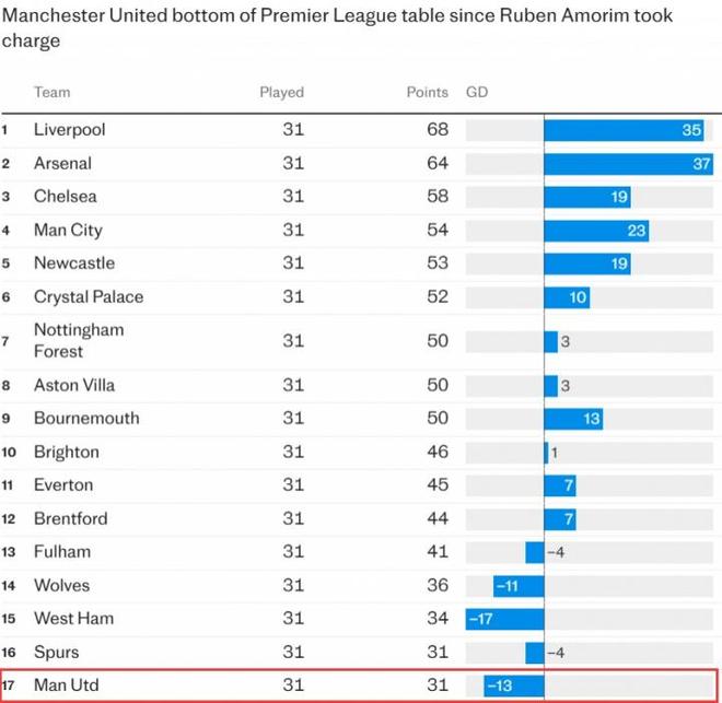 《电讯报》罗列出了阿莫林上任以来的英超积分榜,结果显示,除去升降级的6支球队以外(比赛场数不一致无法比较),曼联在阿莫林治下31轮的战绩英超垫底,所得积分甚至不如前两名利物浦和阿森纳的一半。