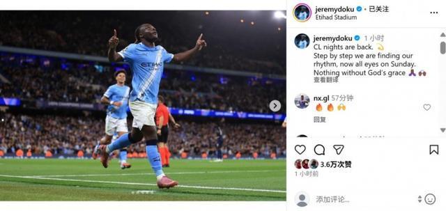 直播吧9月19日宣 在本轮欧冠,曼城2-0击败那不勒斯。本场比赛多库打进精彩进球,他也在个人社媒晒出庆祝进球照片,配文写道:“欧冠之夜回归!我们一步一步找回节奏,现在专注于周日的