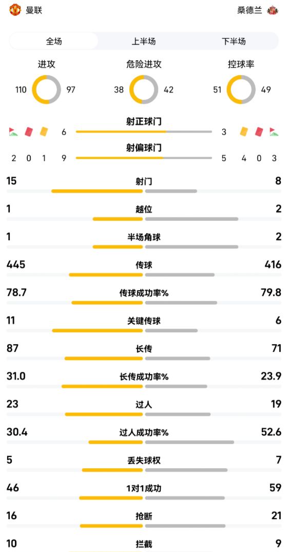 曼联vs桑德兰全场数据:射门158,控球率51%49%