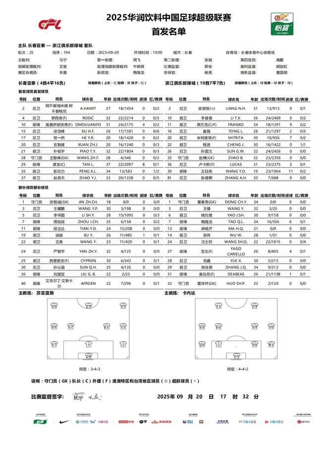 北京时间9月20日19点,中超第25轮长春亚泰对阵浙江,赛前公布首发名单。