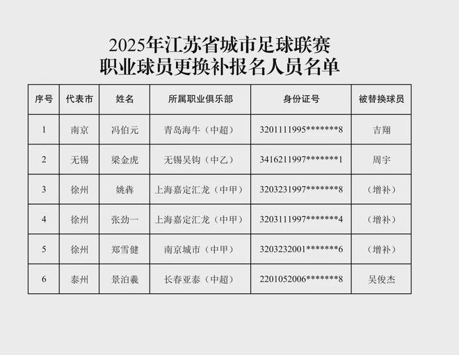 雷速体育9月29日宣 北京时间今日,“苏超”官方发布了关于2025年江苏省城市足球联赛职业球员更换补报人员名单的公示。