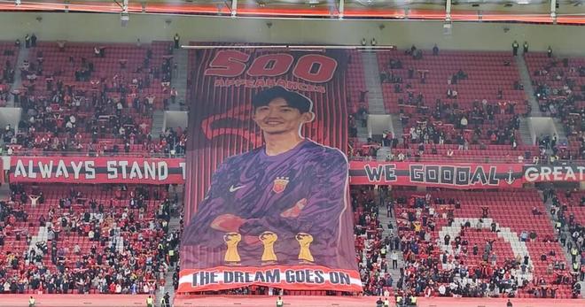 北京时间11月25日,亚冠精英联赛,上海海港主场对阵FC首尔。赛前,海港球迷在东看台打出巨型TIFO。TIFO上是球队主力门将颜骏凌的形象,有数字“500”,是为了纪念颜骏凌代表海港在各